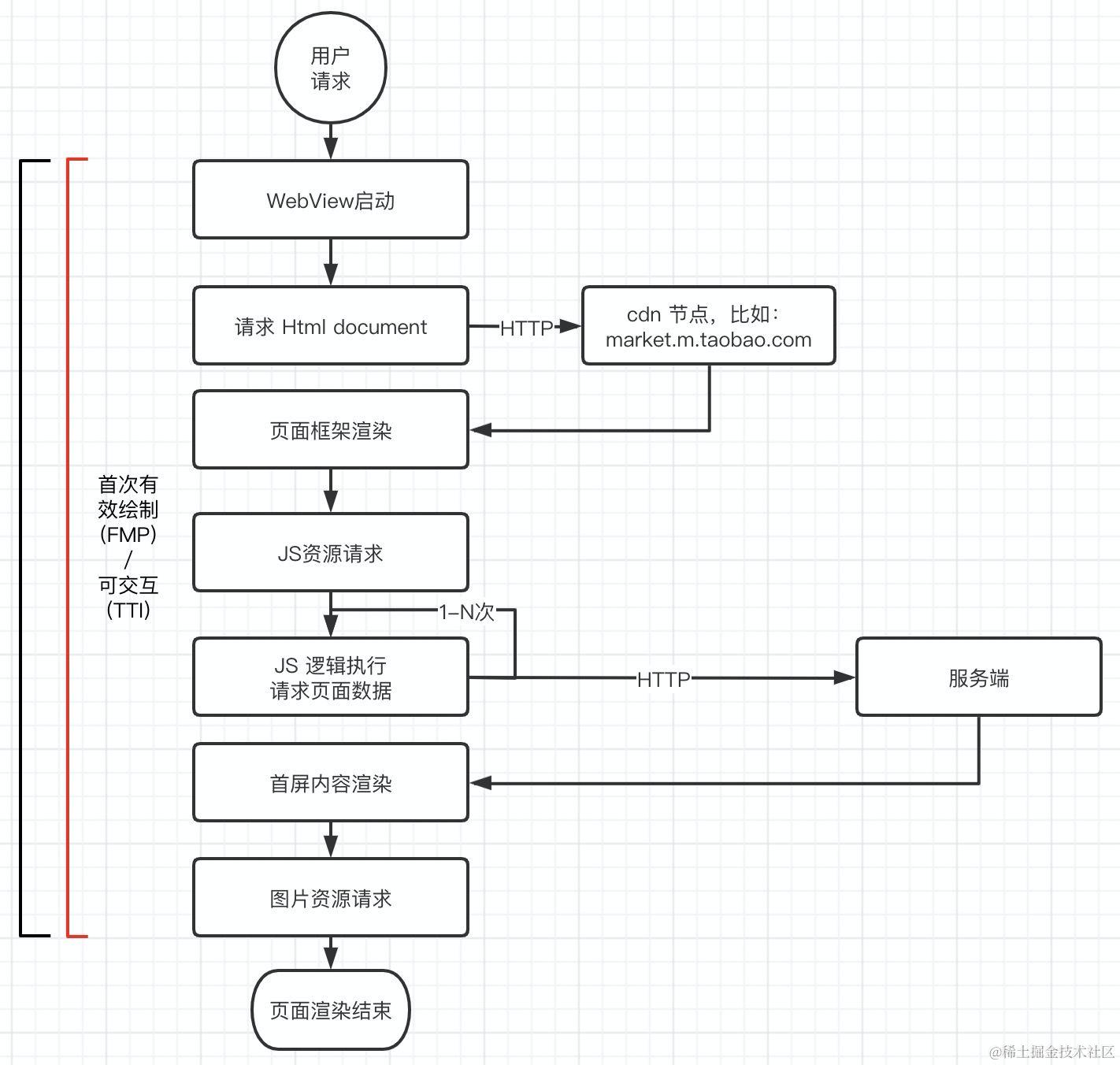 想要优化首屏的渲染速度,首先得从整个页面访问请求的链路上看,借用阿里巴巴淘系技术的一张图,下面是常规端上 H5 页面访问链路