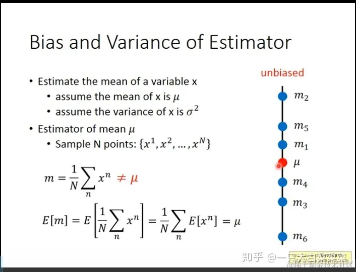 这里举了一个均值估计的例子。通常情况下对x的均值估计是取n个点,做个平均。通过这种方式得到m1,m2,m3....当然这些m和真实的u有差距,但是如果对估计出来的所有的m取个期望,就可以看作是样本真实的u(因为数目很多),也就是m是均匀的散布在u的上下。 这种估计出来的结果和真实一样,所以叫做无偏估计。