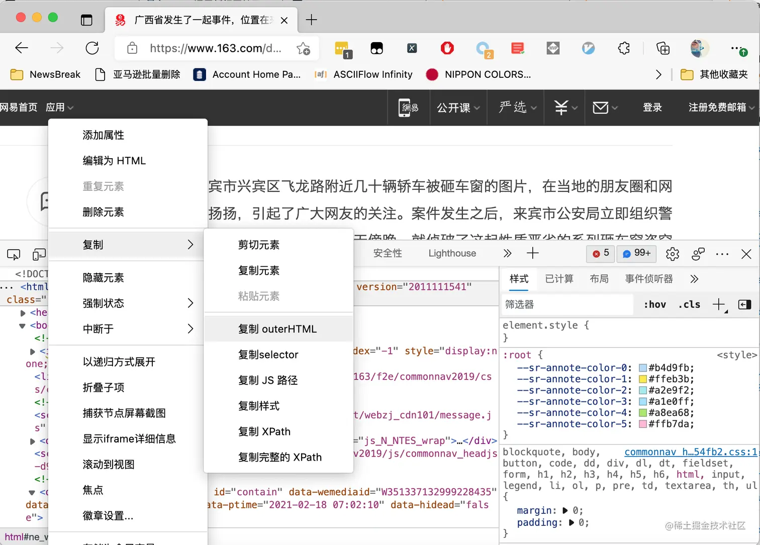 首先在浏览器的开发者工具里面,直接复制经过js 渲染后的源代码: