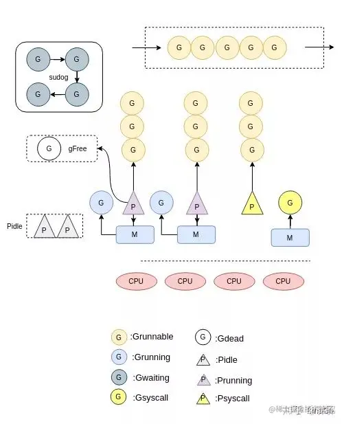 _Grunnable: 没有执行代码,没有栈的所有权,存储在运行队列中,可能在某个P的本地队列或全局队列中(如上图)。