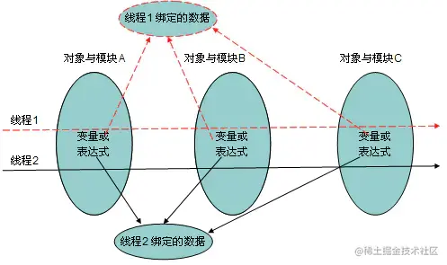 可是将data数据和当前允许的线程绑定在一块,在模块A和模块B去获取数据data的时候 是通过当前所属的线程去取得data的结果就行了。