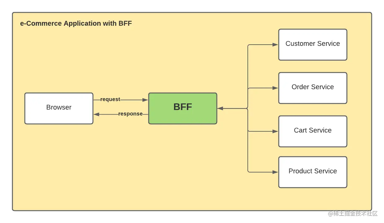有没有这样一个功能,将这些接口做一下聚合,然后将结果的集合返回给前端呢?在目前比较流行微服务架构体系下,有一个专门的中间层专门来处理这个事情,这个中间层叫 BFF(Backend For Frontend)。我曾经工作过的某公司想要将某业务的售卖相关功能给公司其他业务使用,但是接入方一看那么多接口,瞬间就决定不接了,逼不得已该业务平台紧急开发了 BFF 相关功能让其他业务方接入。