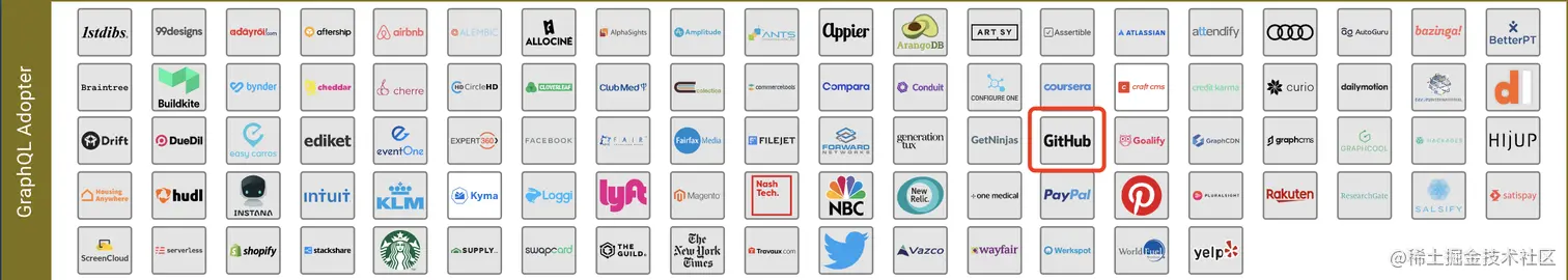上面这个图是 GraphQL 官方的 landscape,你仔细看上面公司图标,一眼能看出来的大的公司只有 Github 了。Facebook 虽说是推出了 GraphQL 的规范以及 JS 的相关实现,但是他自己都没有放出有关 GraphQL 的实际接口,让人对这个技术的信任度都大打折扣。