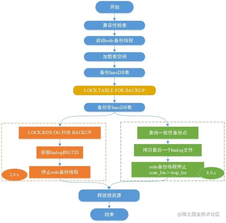 需要注意的是,Xtrabackup 2.4.x与8.0.x在第7、8这两个步骤存在差异,这个差异有MySQL 8.0.x的原因,详情我们在下文介绍。