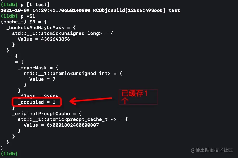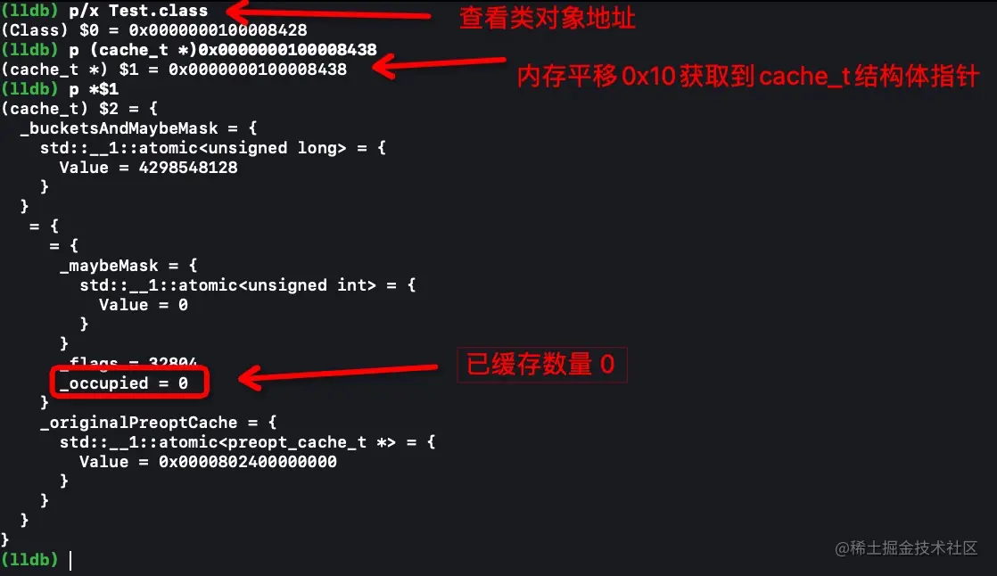 首先我们可以通过p/x打印出对象的首地址,我们知道每个指针占8字节,那么isa和superclass都是指针各占8字节,那么我们只要内存平移16字节0x10,就可以找到cache的首地址了。