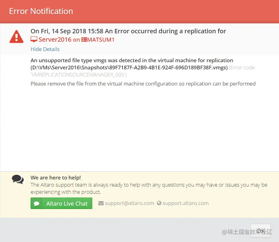 altaro虚拟机复制失败:“不支持的文件类型 VMGS” 51component 2021-10-09 191 阅读1分钟 问题 在要复制的虚拟机中检测到不受支持的文件类型 vmgs(错误代码“VMREPLICATIONSOURCEMANAGER_005) 请从虚拟机配置中删除该文件,以便可以执行复制 原因 附加到 VM 的 VMGS/VFD 文件当前不支持用于复制目的。 解决方案 如果您的虚拟机连接了 VFD(虚拟软盘驱动器),请将其从 Hyper-V 管理器的配置中删除。然后再次尝试复制。 目前,.VMGS(存储虚拟机来宾状态,VM 版本 8.2)不支持用于复制目的,但将在未来几周内得到支持。
