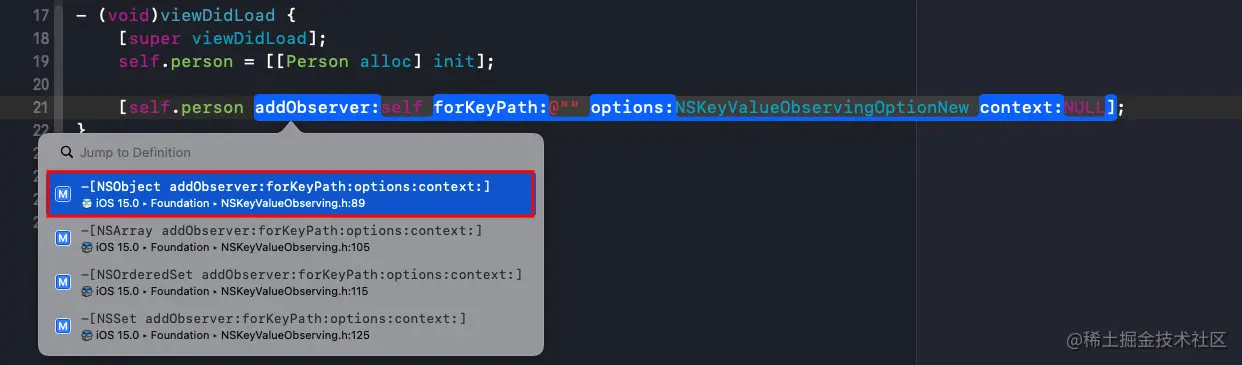 发现addObserver方法来自于NSObject的分类@interfaceNSObject(NSKeyValueObserverRegistration),是针对NSObject的拓展;