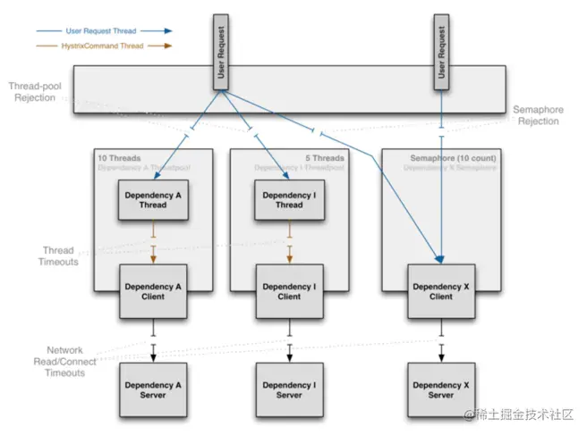 Hystrix使用命令模式HystrixCommand(Command)包装依赖调用逻辑,每个命令在单独线程中/信号授权下执行。