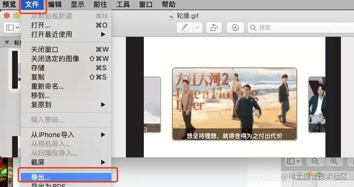 5. 用mac 自带的 “预览” 打开该 gif图,选择 “文件” => "导出":