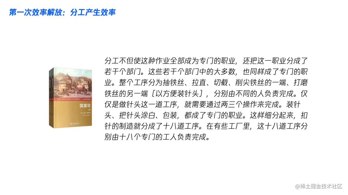 西方经典管理理论认为,组织效率可以归为劳动效率、组织效率和人的效率。美国管理学家泰勒所著的《科学管理原理》被德鲁克誉为“20 世纪最伟大的发明”,劳动效率说认为分工提升生产效率,福特的流水线就是分工和工业化的典型代表。经济学家亚当斯密也在《国富论》里描述了螺丝制造的十八道工序,通过工具的分解能分别由十八个专门的工人负责完成,实现效率上的提升。