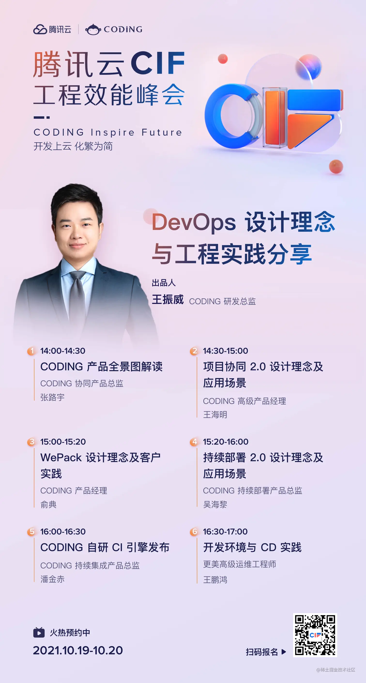 在此背景下,即将于 10 月 19 日线上召开的腾讯云 CIF 工程效能峰会 - DevOps 设计理念与工程实践分享论坛上,CODING 研发总监王振威将携手 6 位资深产品大牛,为你解答: