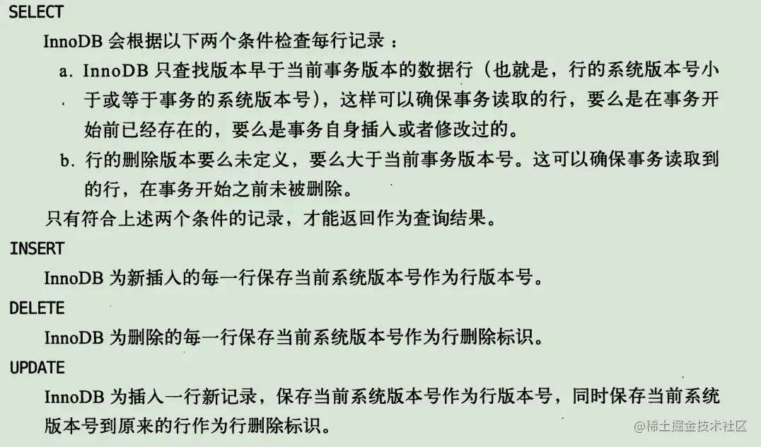 事务开始时候系统版本号(每个新事务都会递增版本号)作为事务版本号,和查询到记录的版本号比较