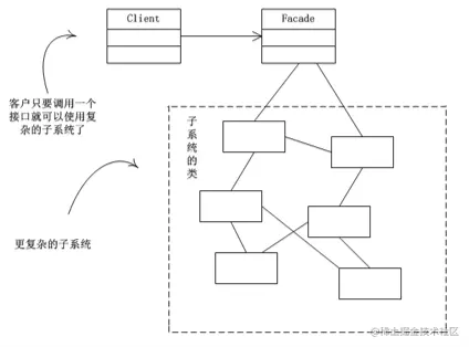 定义一个高层接口,给子系统中的一组接口提供一个一致的界面(比如在高层接口提供四个方法ready, play, pause, end ),用来访问子系统中的 一群接口