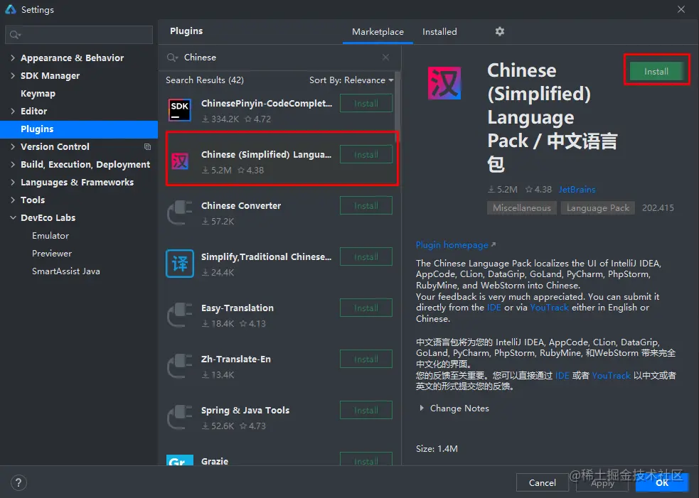 - 点击“Plugins”,搜索“Chinese”,选择第二个