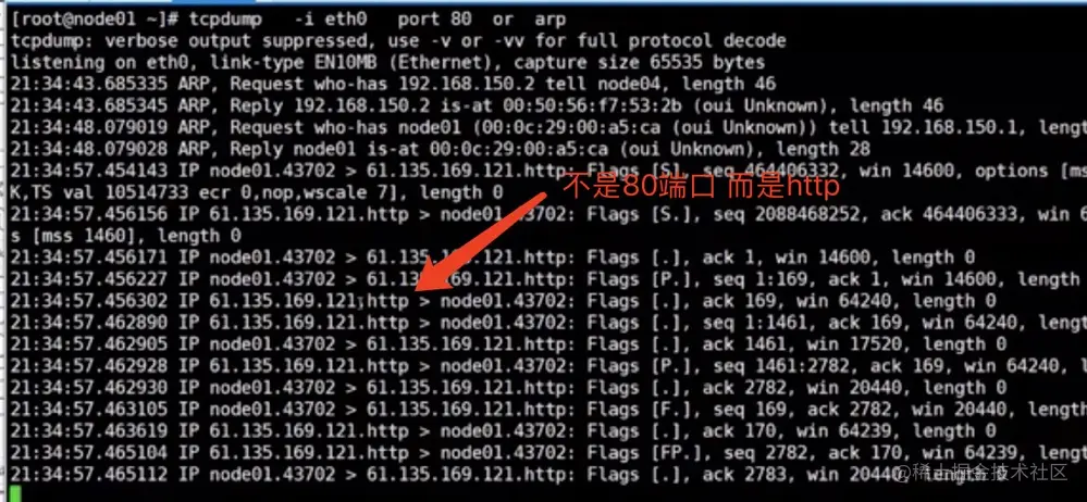 如果不带 -n: tcp -i eth0 port 80 or arp