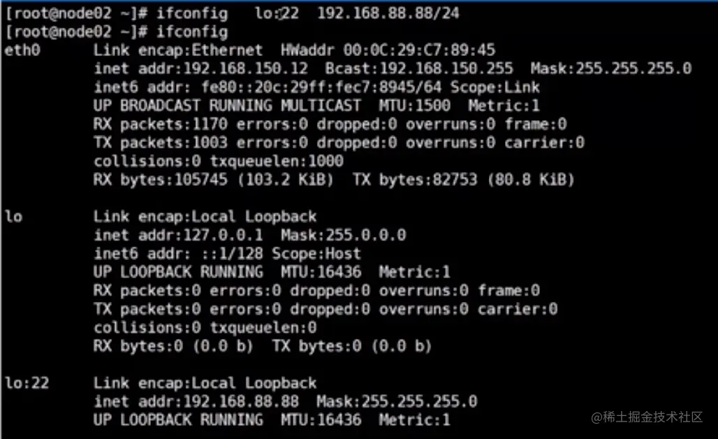 在节点2上设置一个新的环回接口: ifconfig lo:22 192.168.168.88/24