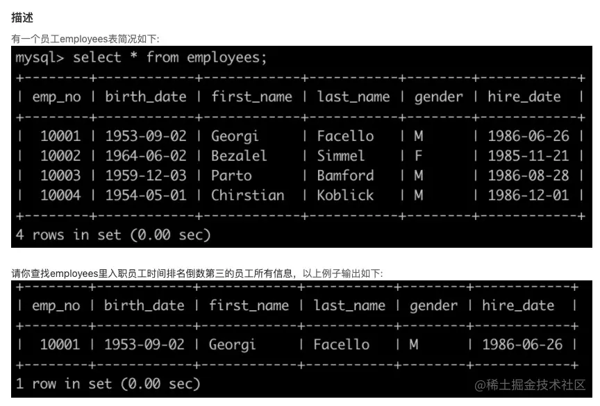 我的思路: 先取出入倒数第三的hire_date(员工入职日期),然后取出对应hire_date(员工入职日期)的数据行即可。