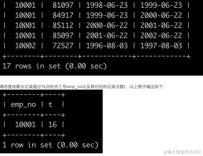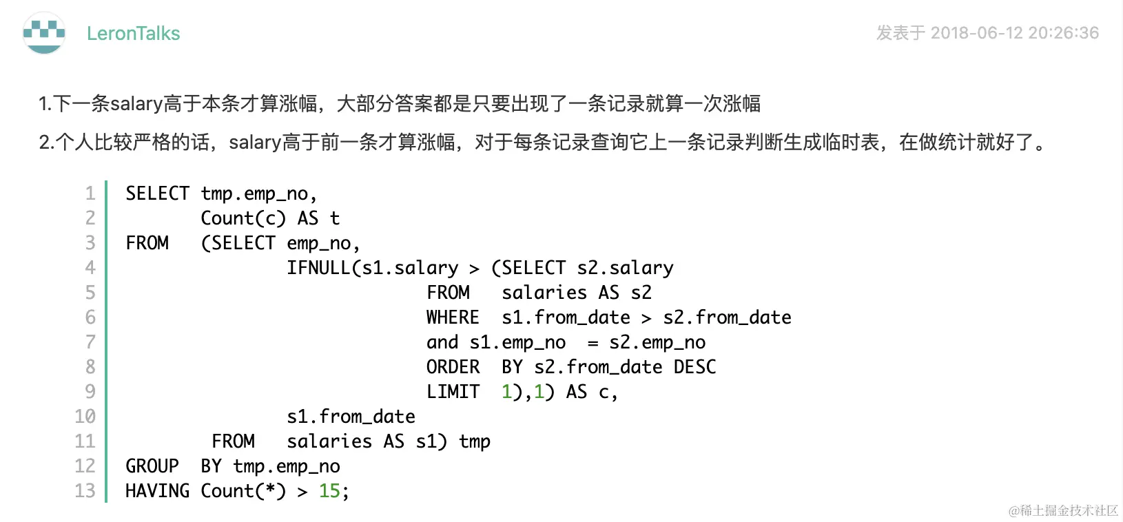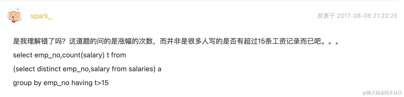 在这题的讨论里看到这样一条讨论,然后看了下这个讨论下的评论,大家讨论的点是这题想统计的员工薪资涨幅次数大于15次的数据,而不是薪资表中有15条以上记录的员工数据。