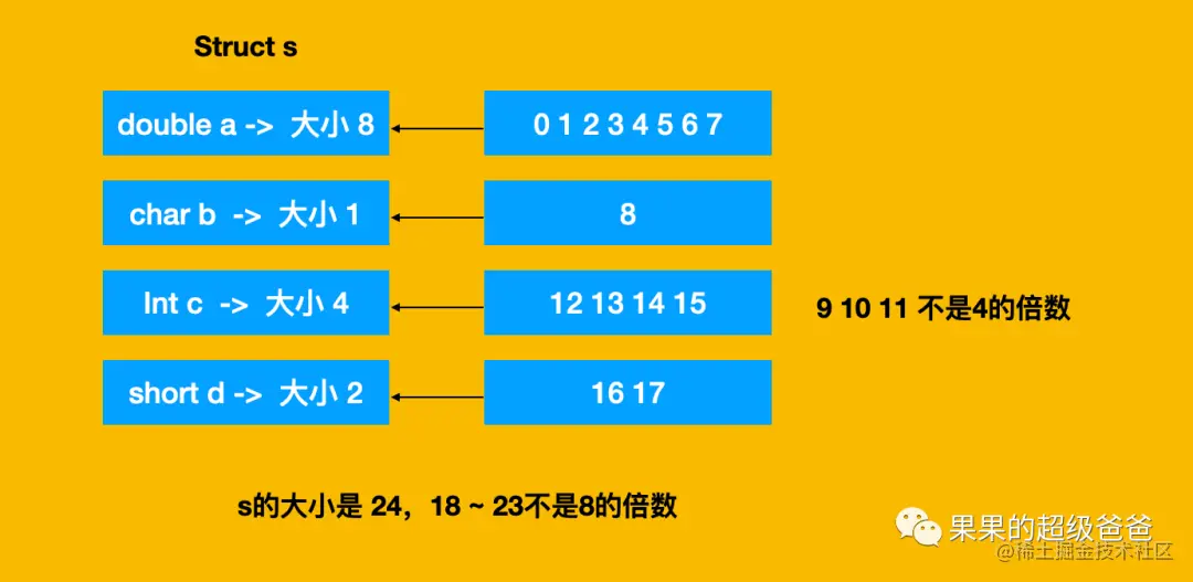 // 结构体大小需要是其内部最大属性的整数倍: 大于15的8的倍数 --> 16