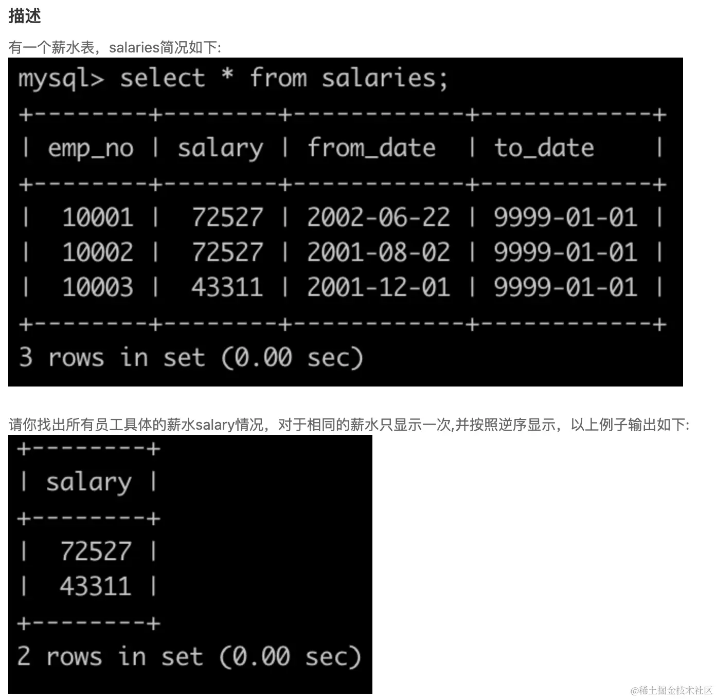 我的思路: 首先筛选出题目中两个关键信息:只要薪水这一列、需要去重降序排列;按要求,我们