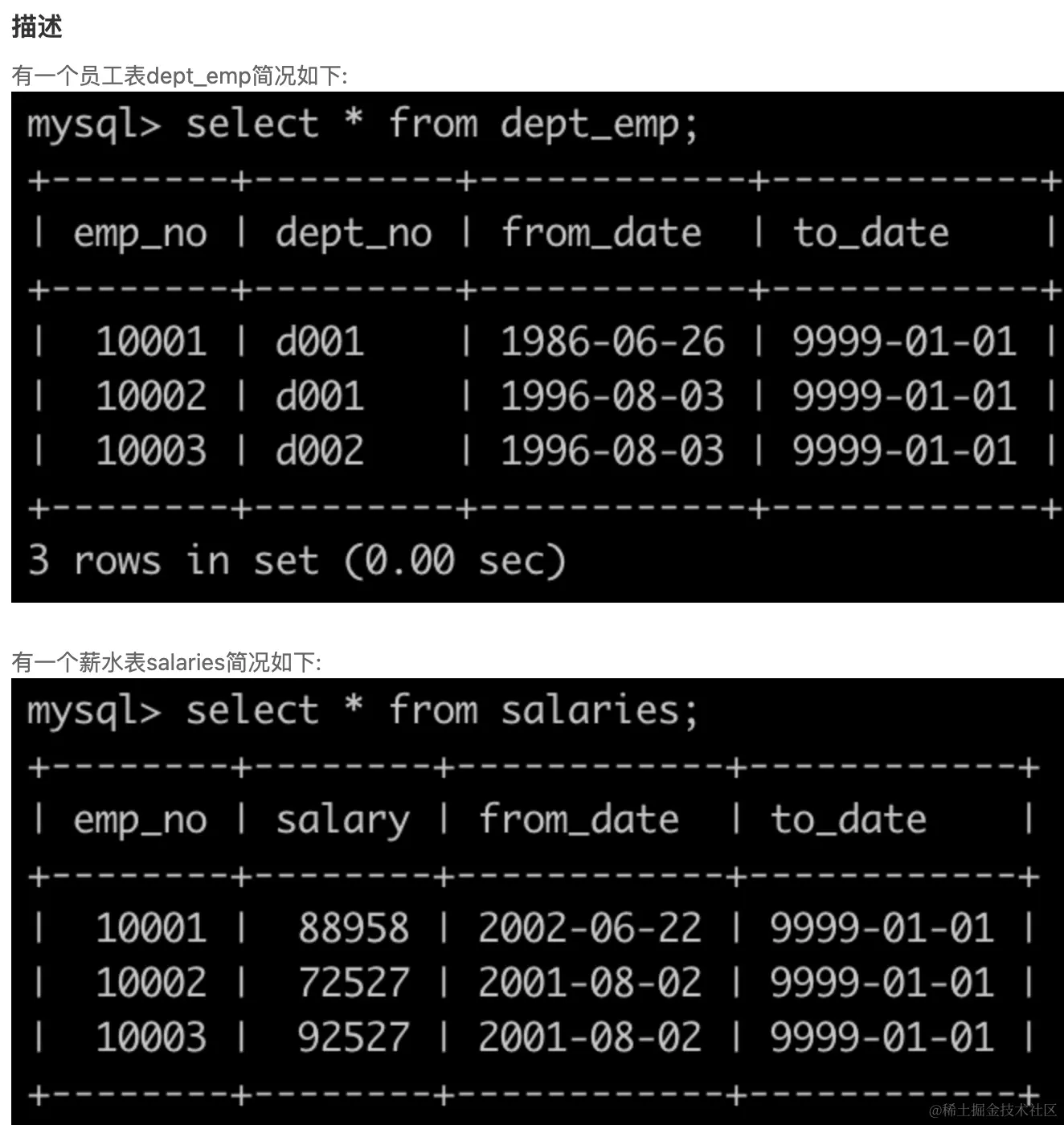 select salary,利用group by进行去重,order by salary desc降序排列,同时我们用where to_date = '9999-01-01'筛选出了当前还在公司的员工。