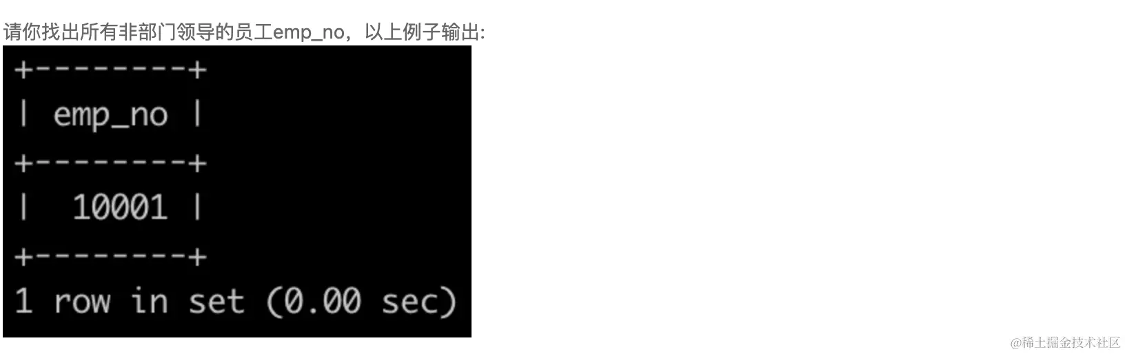 我的思路: 在员工表employees中取出员工编号不在部门领导表dept_manager中的员工编号即可。