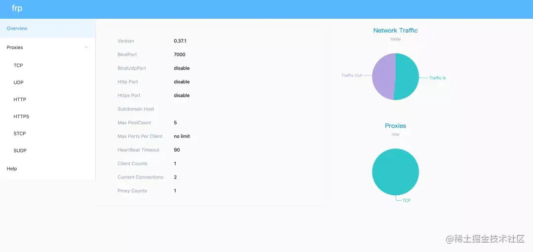 最后,刷新 Frp Dashboard 管理页面,可以观察到 Frp 客户端的连接信息