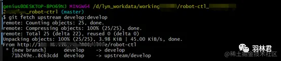 配置完成之后,我们用git remote -v命令再次查询,这个时候就看到了配置好的upstream地址。这个时候我们就可以随意拉去上游仓库的代码了。用如下命令: