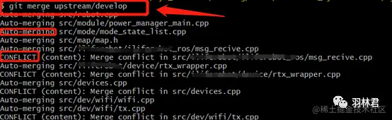 在合并之后我们看到其中有些部分可以自动合并,有些会产生conflict,我们需要手工进行修改,这个部分就是我们git里面的基本操作了哈。合并冲突代码这个部分现在主流的代码编辑器都可以人性化的提示,如果需要看的话,大家也可以看我之前的git文章合集哈。