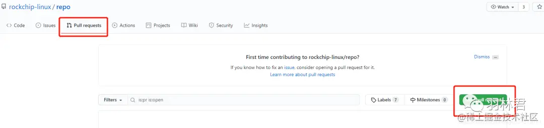 当我做了一些修改之后,我就可以在上游仓库的界面中选择pull request,再点击新建一个合并请求。如下所示: