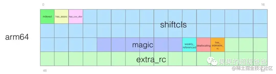 | extra_rc | 该对象的引用计数值,实际上是引用计数值减 1。如果对象的引用计数为10,那么 extra_rc 为 9。如果引用计数大于 10 则需要使用 has_sidetable_rc | 19 | 44~63 |