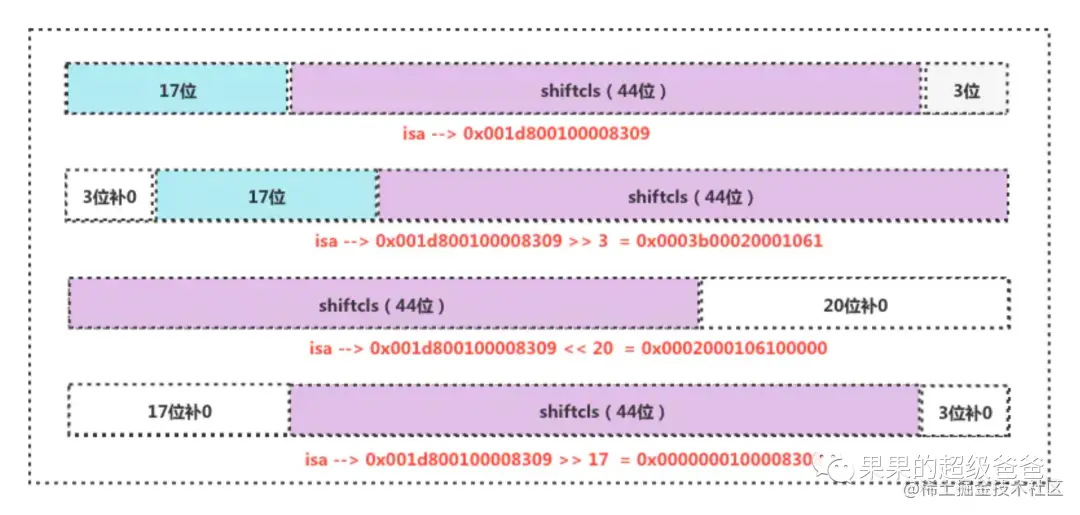 主要是由于shiftcls处于isa指针地址的中间部分,前面还有3个位域,为了不影响前面的3个位域的数据,需要右移将其抹零。