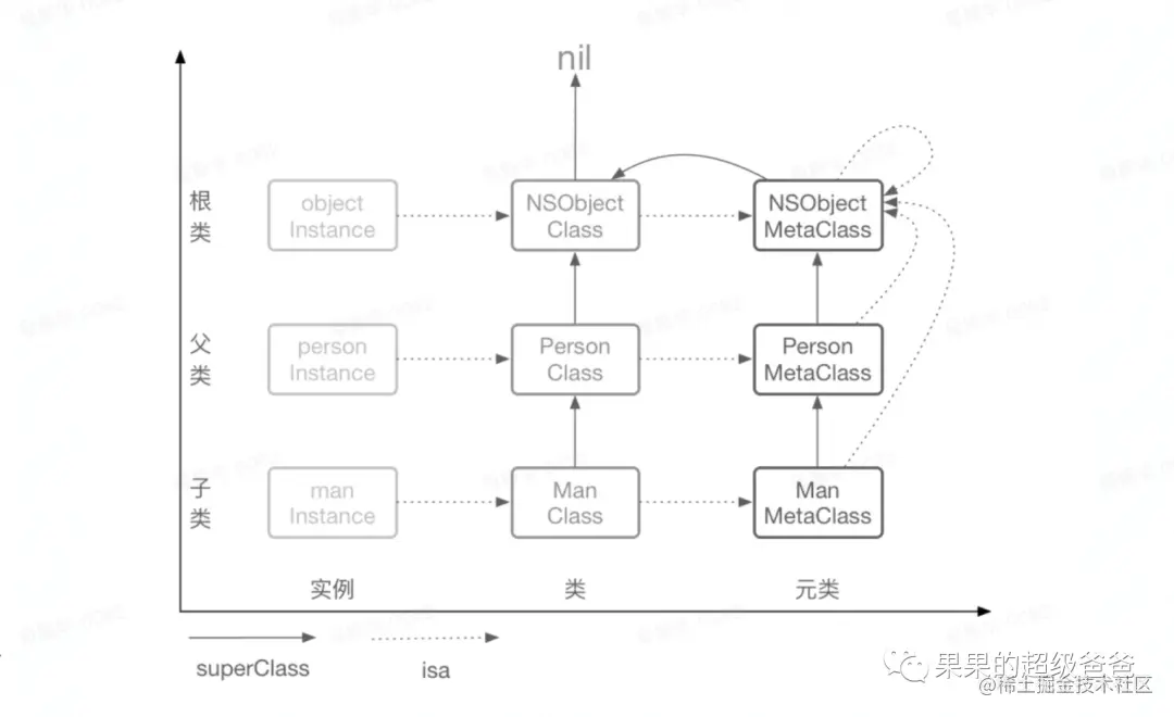 2、元类继承父元类最终都继承根元类NSObject MetaClass