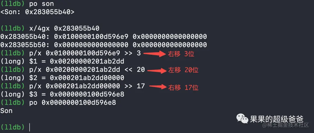 通过x/4gx obj得到obj的存储信息,当前类的信息存储在isa指针中,且isa中的shiftcls此时占44位(macOS环境为例__x86_64__)想要读取中间的44位类信息,就需要经过位运算