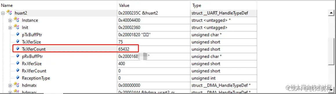 debug看到如下数据,原因上文提到。就是我遇到我们Linux核心板掉电之后会产生一个中断,导致这里判断时候自动减一,TxXferCount从 0 变成 -1 因为是无符号数据,所以数据表现为65535。