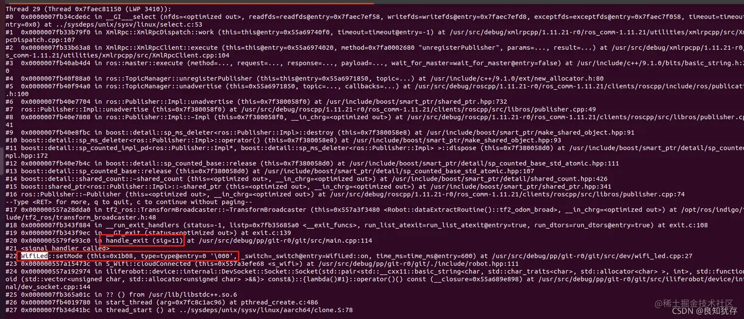 对应打印出所有线程的堆栈信息之后,我们就进行一点点查看,但是如果你的代码定义了 信号处理函数,例如我使用了 handle_exit进行处理,然后我就在所有线程堆栈信息里面去搜索对应最后面信号处理的函数,再往回查看程序执行的过程。