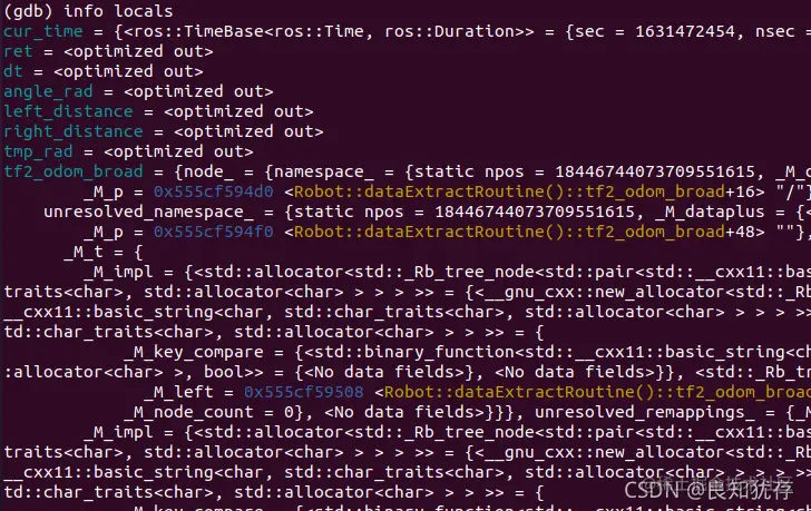 然后我们使用 info locals查看一下保存的本地变量的信息
