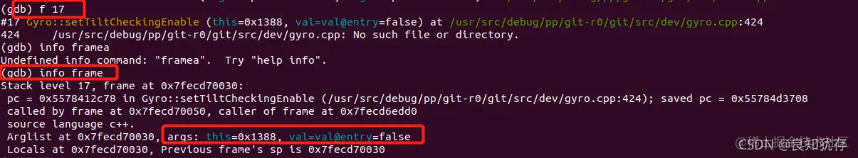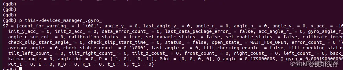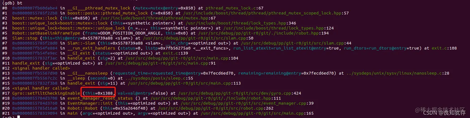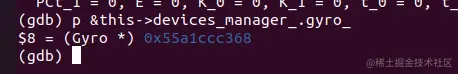 然后我们需要确认该指针是什么什么出现问题的,进行第20帧数据的详细查看。其中我们用p命令查看该类下面的对应的和17帧this的关系,确认gyro_在这个函数执行的时候,地址是否正确。