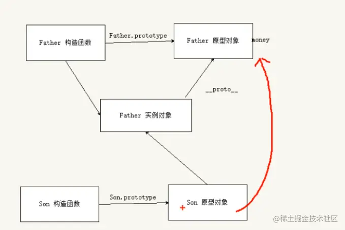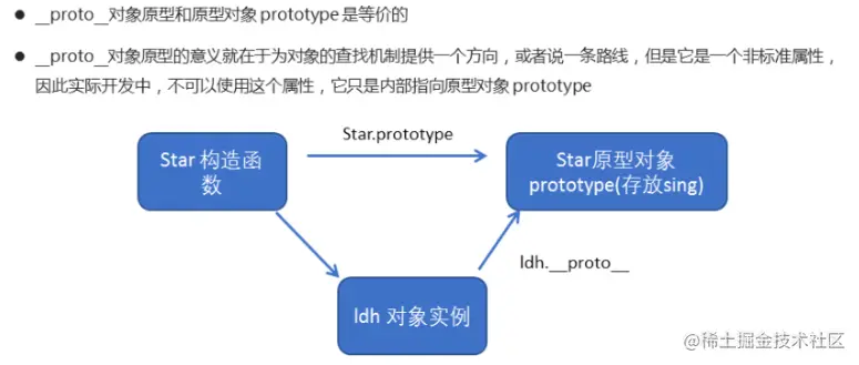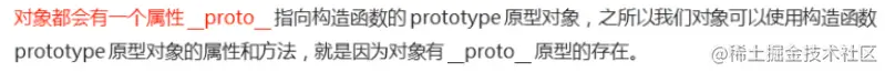 对象都会有一个属性 __proto__指向构造函数的prototype 原型对象,之所以我们对象可以使用构造函数prototype 原型对象的属性和帆帆发,就是因为对象有 ____proto__原型的存在.proto两边都有两个下划线(__)