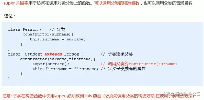 super 关键字用于访问和调用对象父类上的函数,可以调佣父类的构造函数,也可以调用父类的普通函数