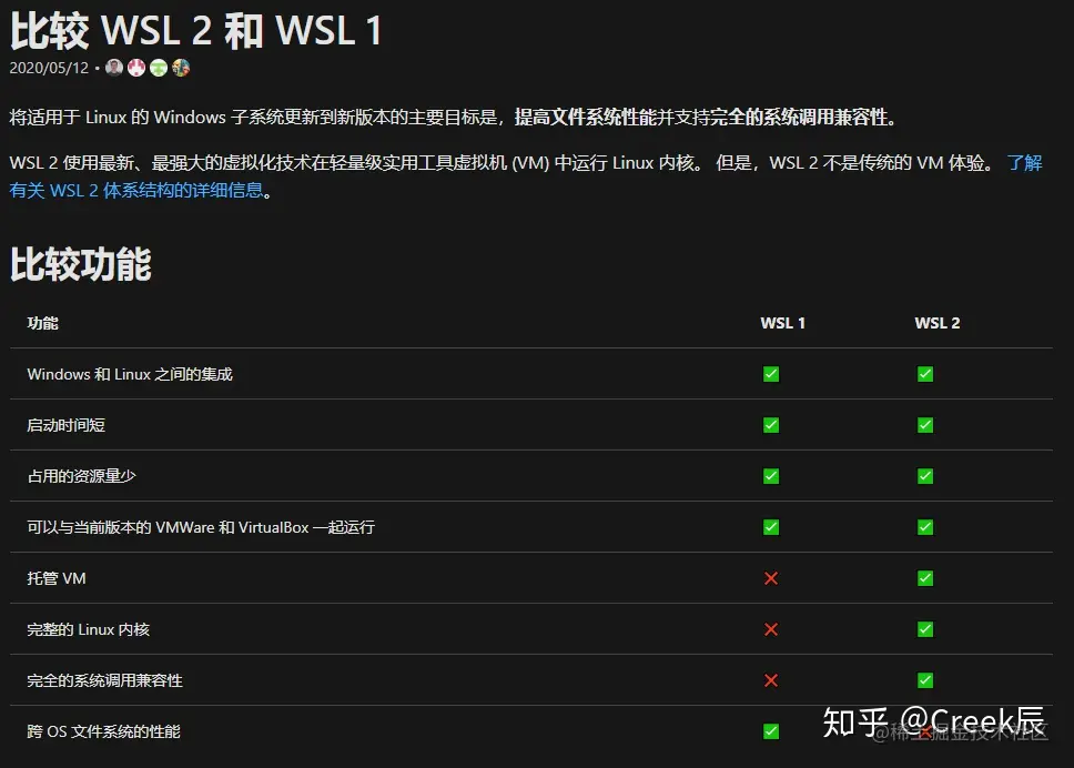 关于WSL1和WSL2的区别,官网对比如下: