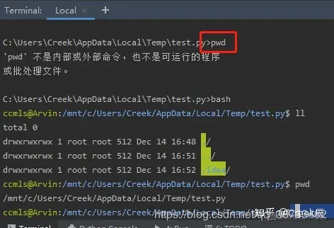 运行即可,哇,真的美滋滋啊,你甚至不需要在Ubuntu里去创建一个py文件。 同样,我们看下terminal,发现是Windows的命令行,没关系,一个bash命令,美滋滋。