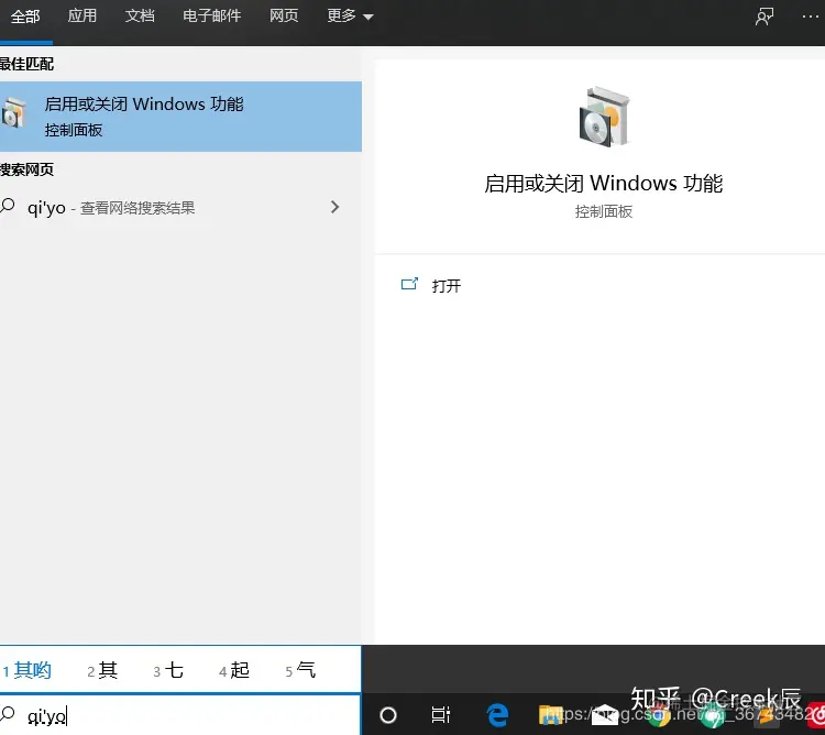 按照如下操作: 搜索框输入“启用或关闭Windows功能”,点开即可(实际上,仅仅输入几个拼音即可),如下图: