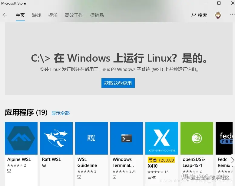 打开Microsoft Store,输入wsl,搜索。 点击获取这些应用,如下图: