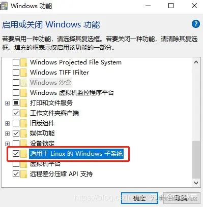 勾选 适用于Linux的Windows子系统,系统会自动配置,然后重启即可。