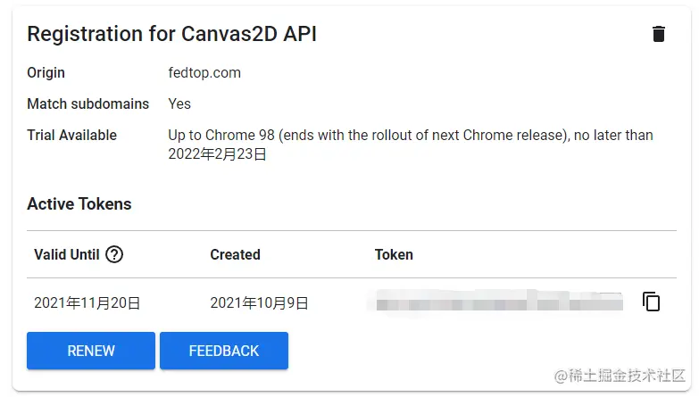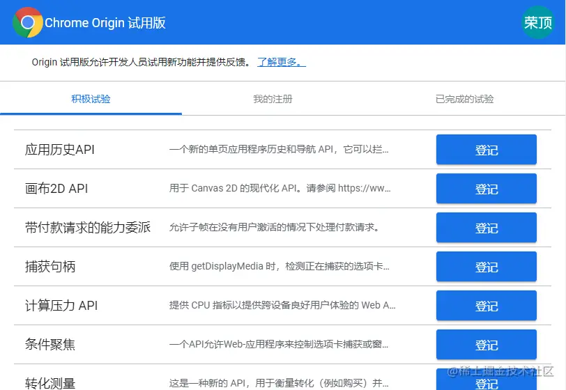 chrome95 开始,chrome 会每隔 4 周就会更新一个版本,对于喜欢尝鲜的同学们,我推荐下载 chrome 测试版或者金丝雀版本来体验最新的特性. 对于一些正在试验中的 API 我们也可以通过下面这个网站提交登记,或者体验资格~