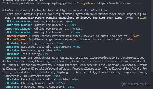 lighthouse https://www.example.com --view这里我通过百度为例子,大家替换为自己想测试的站点即可