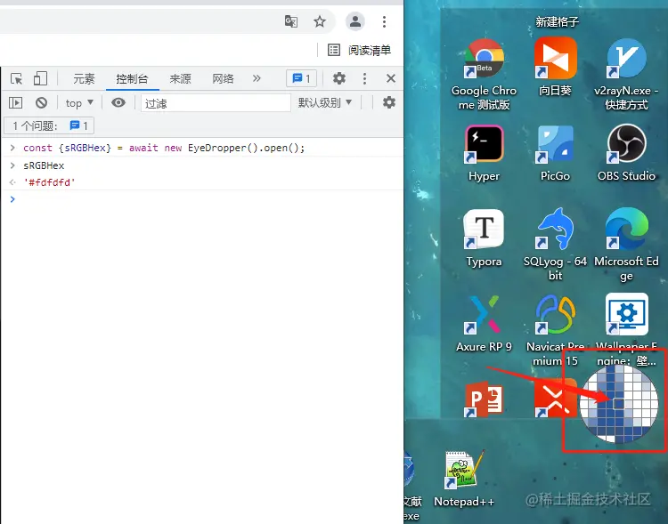 这个可以在屏幕的任何地方取颜色哦~ 包括浏览器外面的区域,它有什么好处呢?不知道大家用过 figma,或者蓝湖没有,诸如此类的 web 端 ui 设计应用,取色是一个很常用的功能项(包括我们平时开发页面时,不需要借用其他工具去别的窗口提取UI给出的设计图某块区域的颜色值,现在通过这个特性就能简单的实现!) -