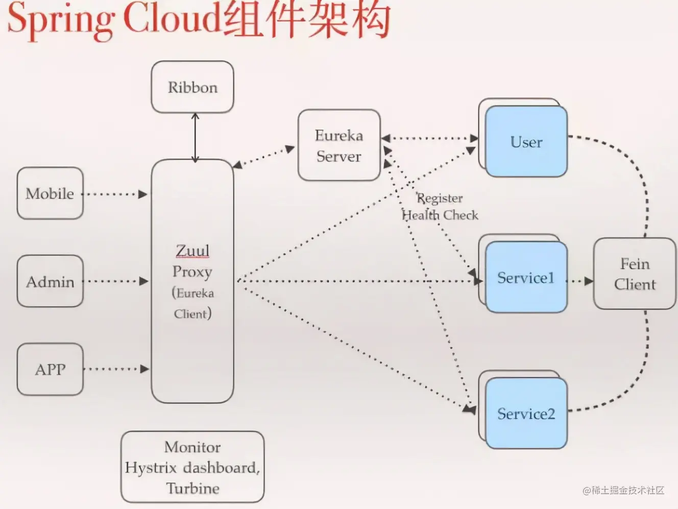 偷懒偷了张图,图中漏掉了 Config Server 和链路追踪组件。但是结合上文的介绍,我们大致可以脑补出这两个东西在图中的位置。Config Server 是一个与所有服务相连的服务集群,链路追踪组件则集成在每个服务中。