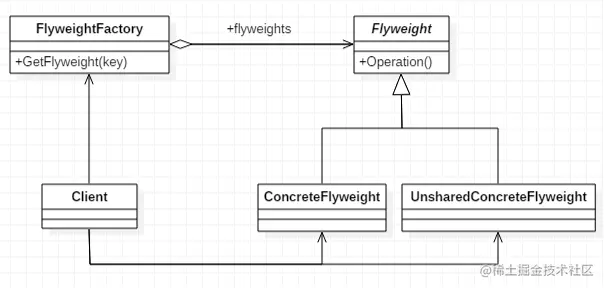 FlyWeight 是抽象的享元角色, 他是产品的抽象类, 同时定义出对象的外部状态和内部状态(后面介绍) 的接口或实现